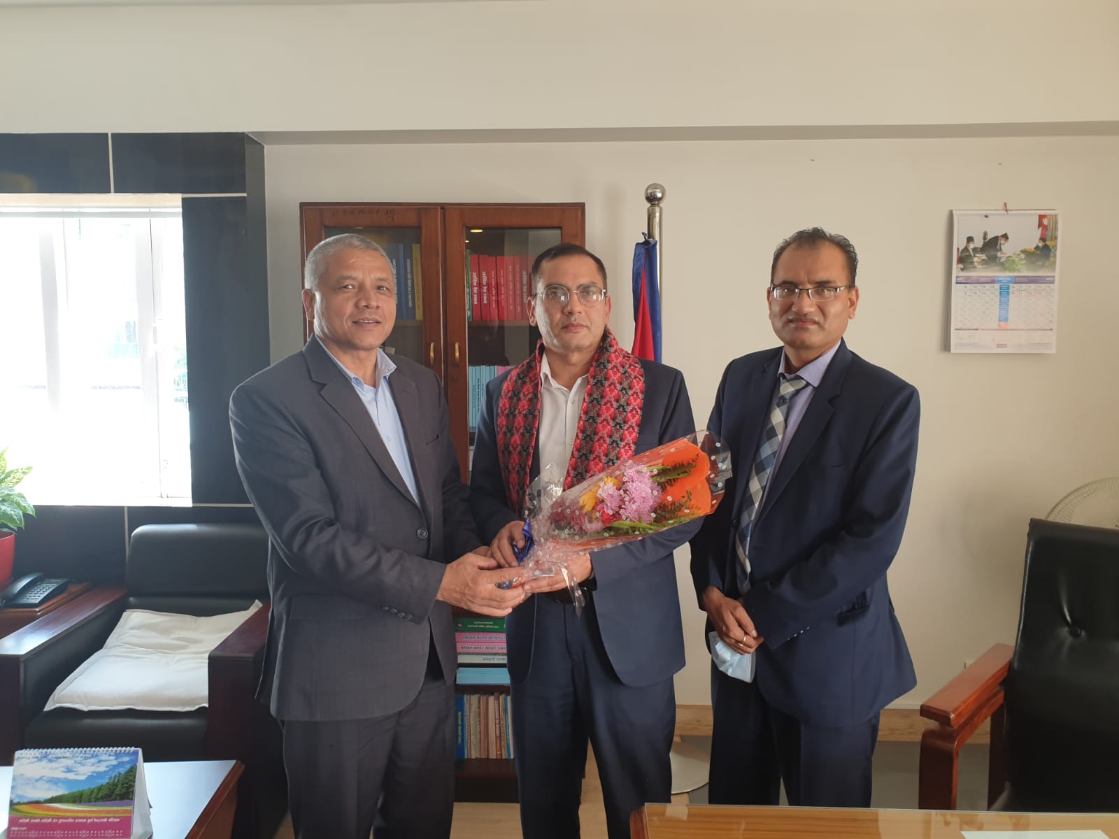 Newly appointed revenue secretary Mr. Rameshwor Dangal congratulated by the CEO Mr. Shankar Kumar Rayamajhee and ACEO Mr. Damodar Bhandari on 6th Bhadra, 2079.