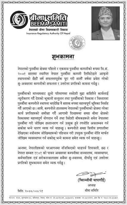 Beema Samiti’s Chairman Mr. Chiranjabi Chapagain’s best wish Message published in the Gorkhapatra Daily on the occasion of the Nepal Reinsurance Company Ltd.’s seventh anniversary.