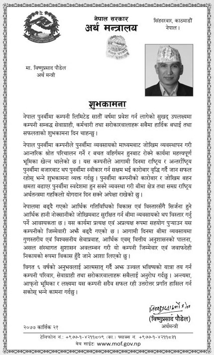 Nepal Government’s honorable Finance Minister Mr. Bishnu Prasad Paudel’s best wish Message published in the Gorkhapatra Daily on the occasion of the Nepal Reinsurance Company Ltd.’s seventh anniversary.