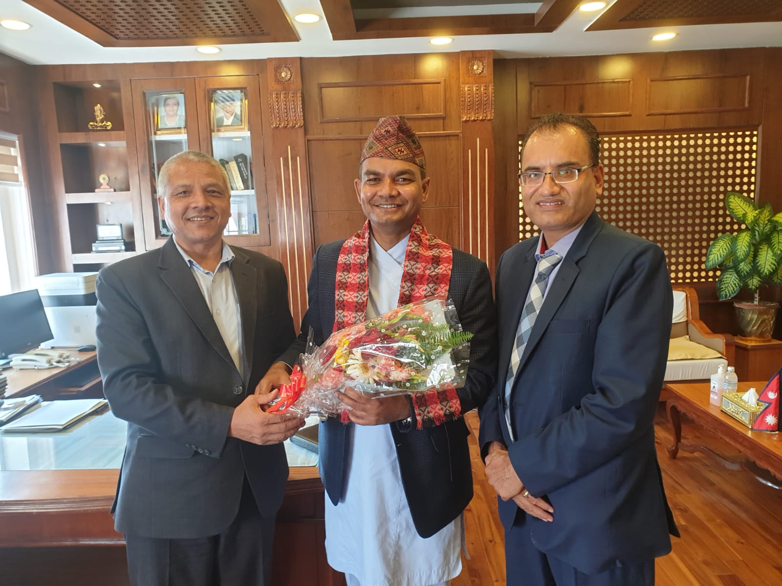 Newly appointed finance secretary Mr. Krishna Hari 'Pushkar' congratulated by the CEO Mr. Shankar Kumar Rayamajhee and the ACEO Mr. Damodar Bhandari on 6th Bhadra, 2079.