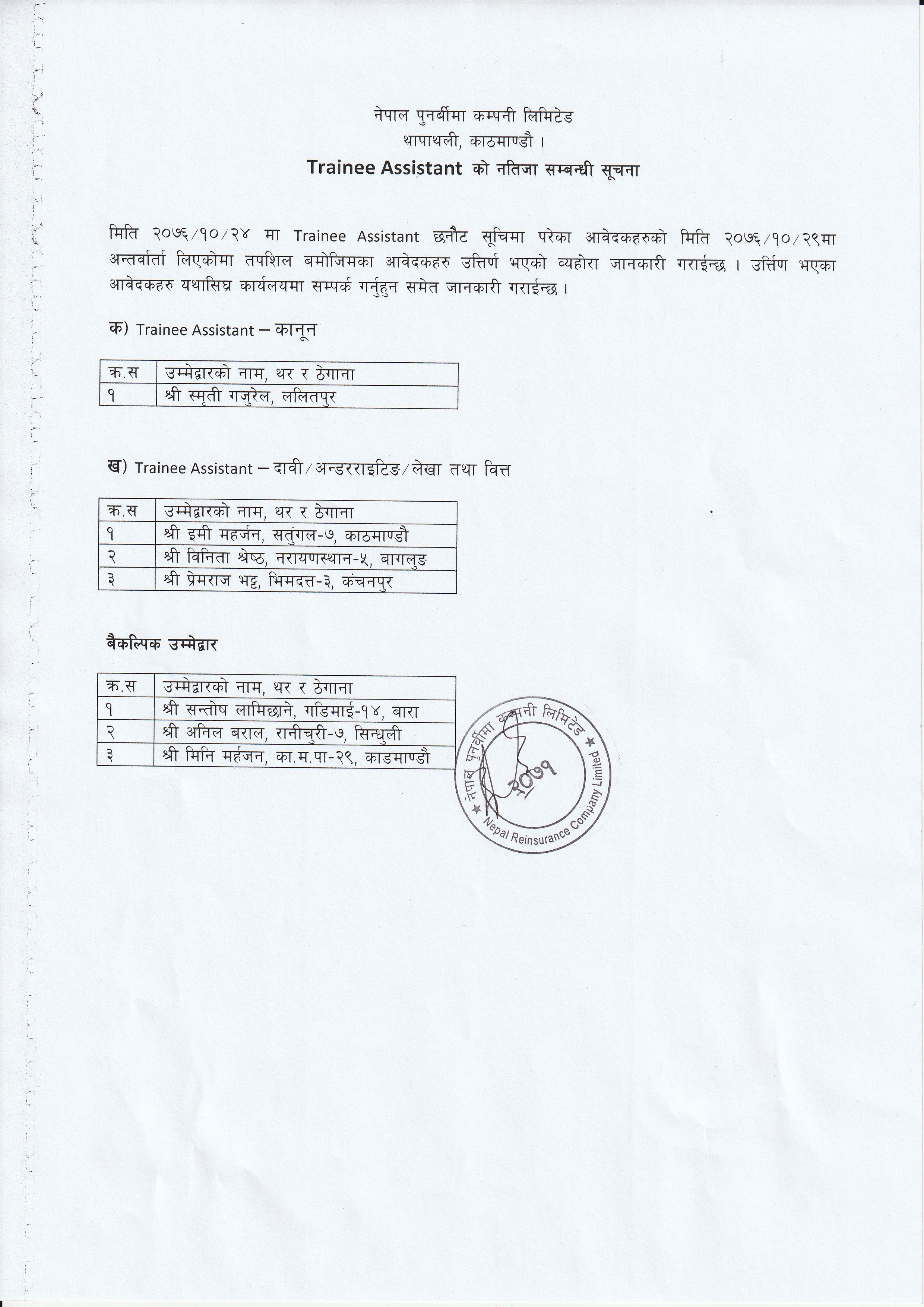 Detail of Shortlisted candidate, Schedule for interview of Trainee Assistant.
