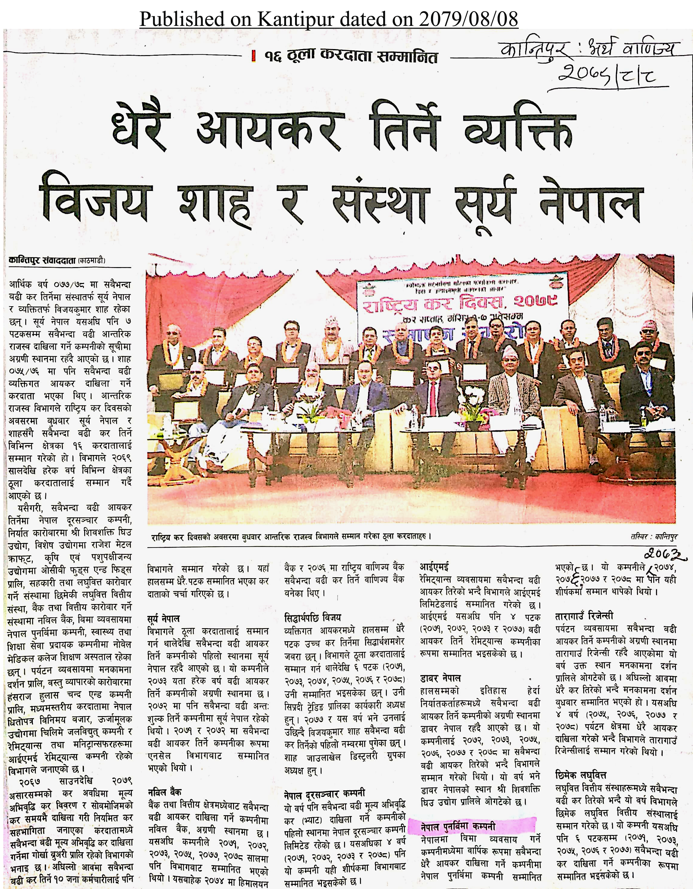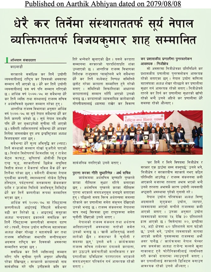 Highest Tax Payer FY 2077/78 news published on Aarthik Abhiyan and Kantipur Newspaper